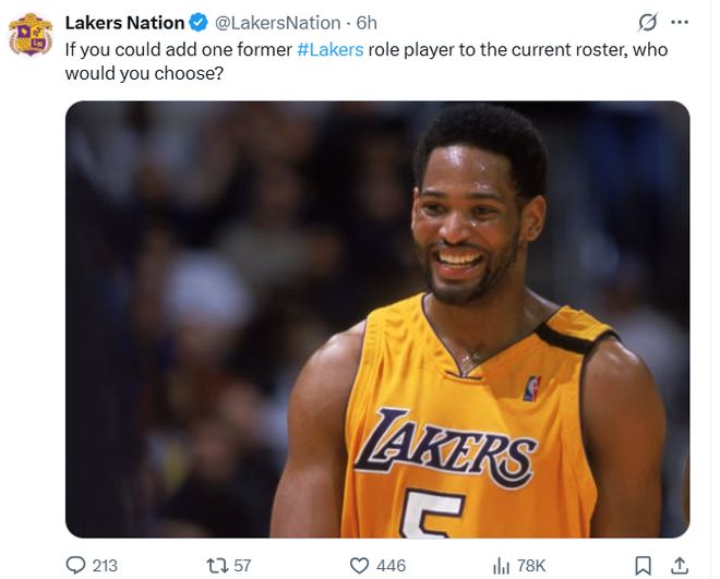 雷速體育8月8日訊 湖人國度通過社交媒體發文提出了一個問題,過去湖人球員如果讓你選一個,加入現在陣容,你選誰? 值得一提的是, 湖人國度在上述提問下的配圖是羅波特·霍里。霍里曾經在1997年被交易至湖人,效力至2003年夏天。期間,他隨OK組合為湖人隊奪得了三座總冠軍戒指,并屢次在季后賽關鍵場次中貢獻關鍵球。整個職業生涯,霍里總共取得了7座總冠軍。