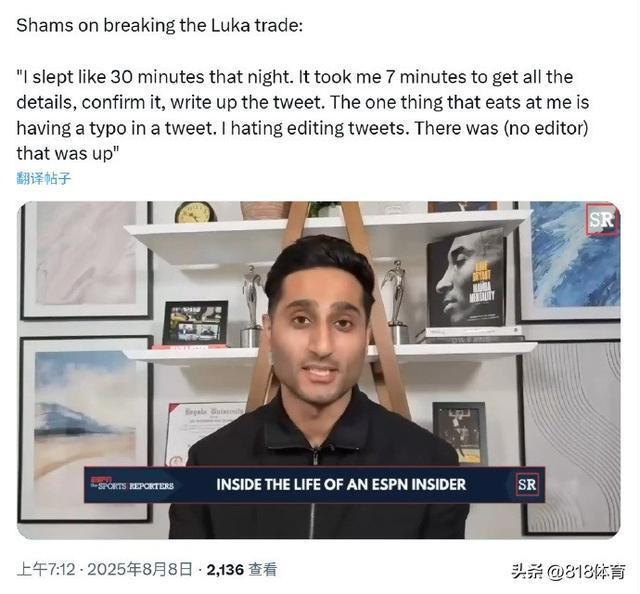在參加《Sports Reporters》節(jié)目中,Shams談推特報道濃眉東契奇交易的細節(jié):“那天晚上,我大概只睡了大概30分鐘。我花了7分鐘時間收集所有細節(jié)、確認信息,然后寫好那條推文。最讓我難受的是推文中出現(xiàn)了錯別字,我討厭修改推文。當時(沒有編輯)在我旁邊。”